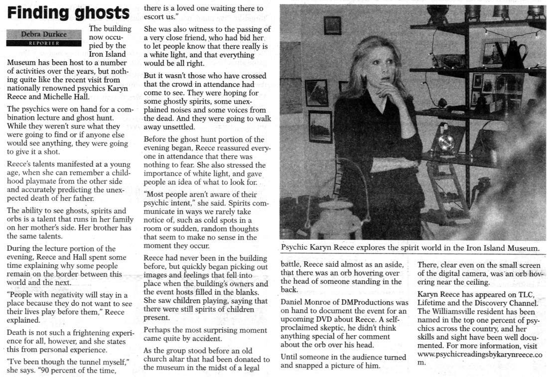 The Iron Island Museum in the Buffalo News The September 5th, 2011 edition of the Buffalo New ran a story about one of the Museum's resident ghosts, Edgar. Click here for the full article at the Buffalo News website The Iron Island Museum on Ghost Lab Ghost Lab visits Iron Island Museum in 2010 and features the muesum on one The Iron Island Museum on TAPS: Ghosthunters VIDEO: Child ghost sits on investigator's lap and the boiler ducts VIDEO: Ghost says Leave me alone!